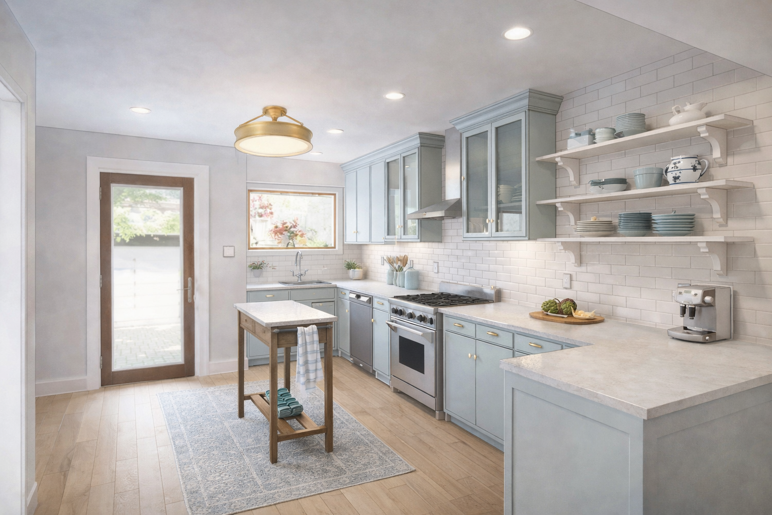 Interior design and visualization for a comprehensive kitchen renovation, featuring 3D perspective renderings carefully aligned with existing photographs to enable direct before-and-after comparison. A detailed 3D model of the kitchen and adjacent spaces was developed, followed by photo-realistic renderings refined in Photoshop. These high-impact visuals provided the client with a clear, accurate preview of the transformed space for review and approval.
