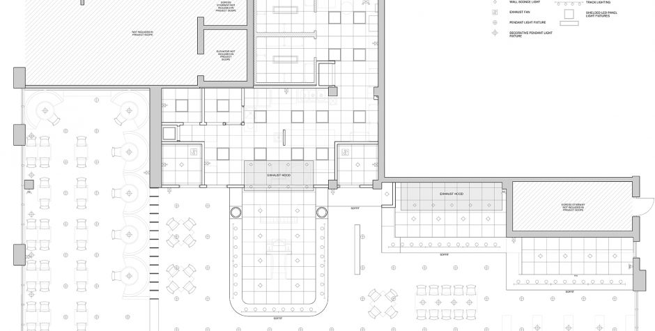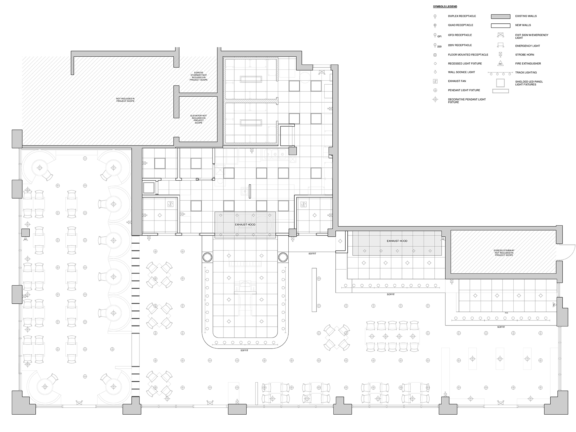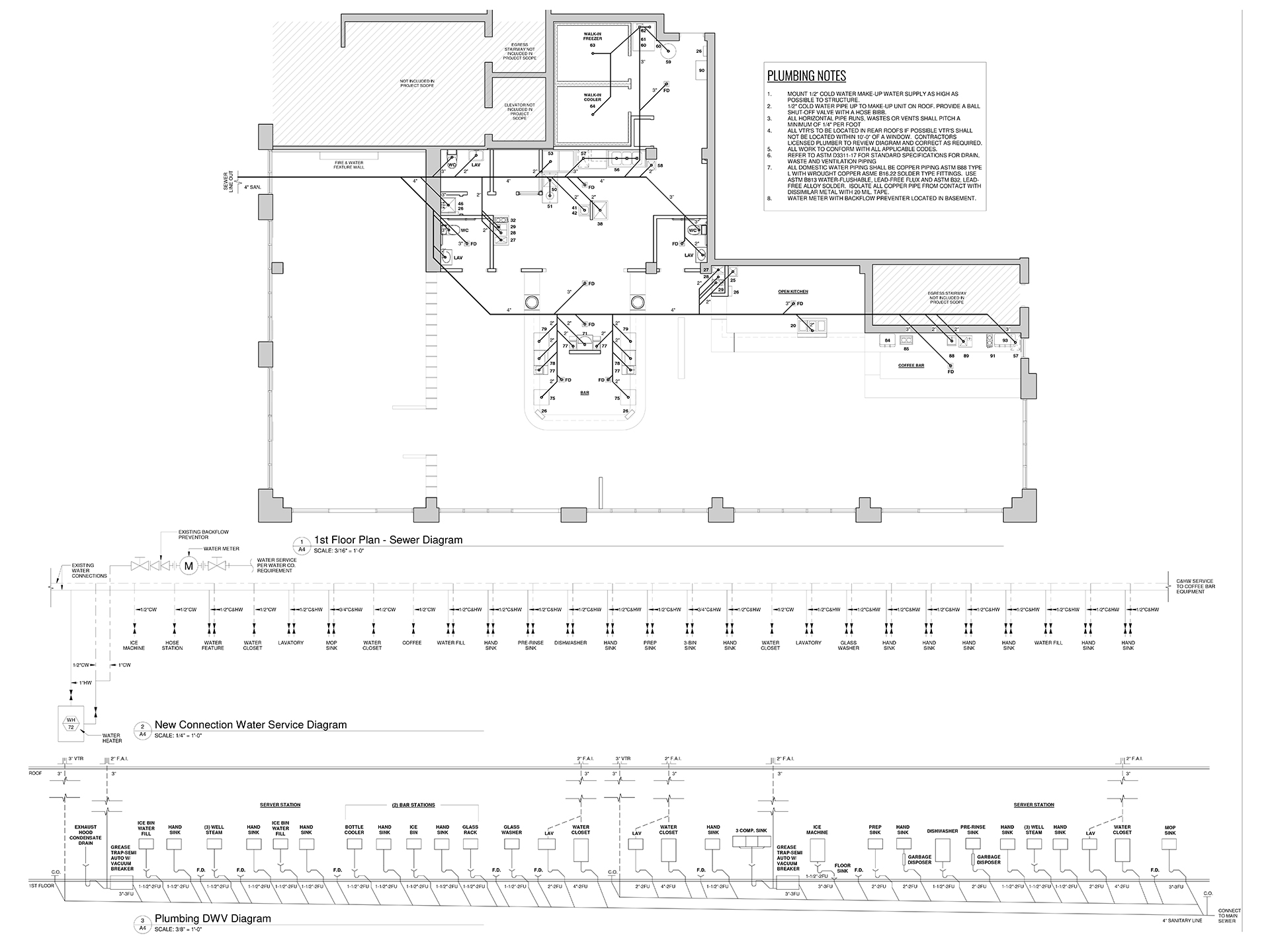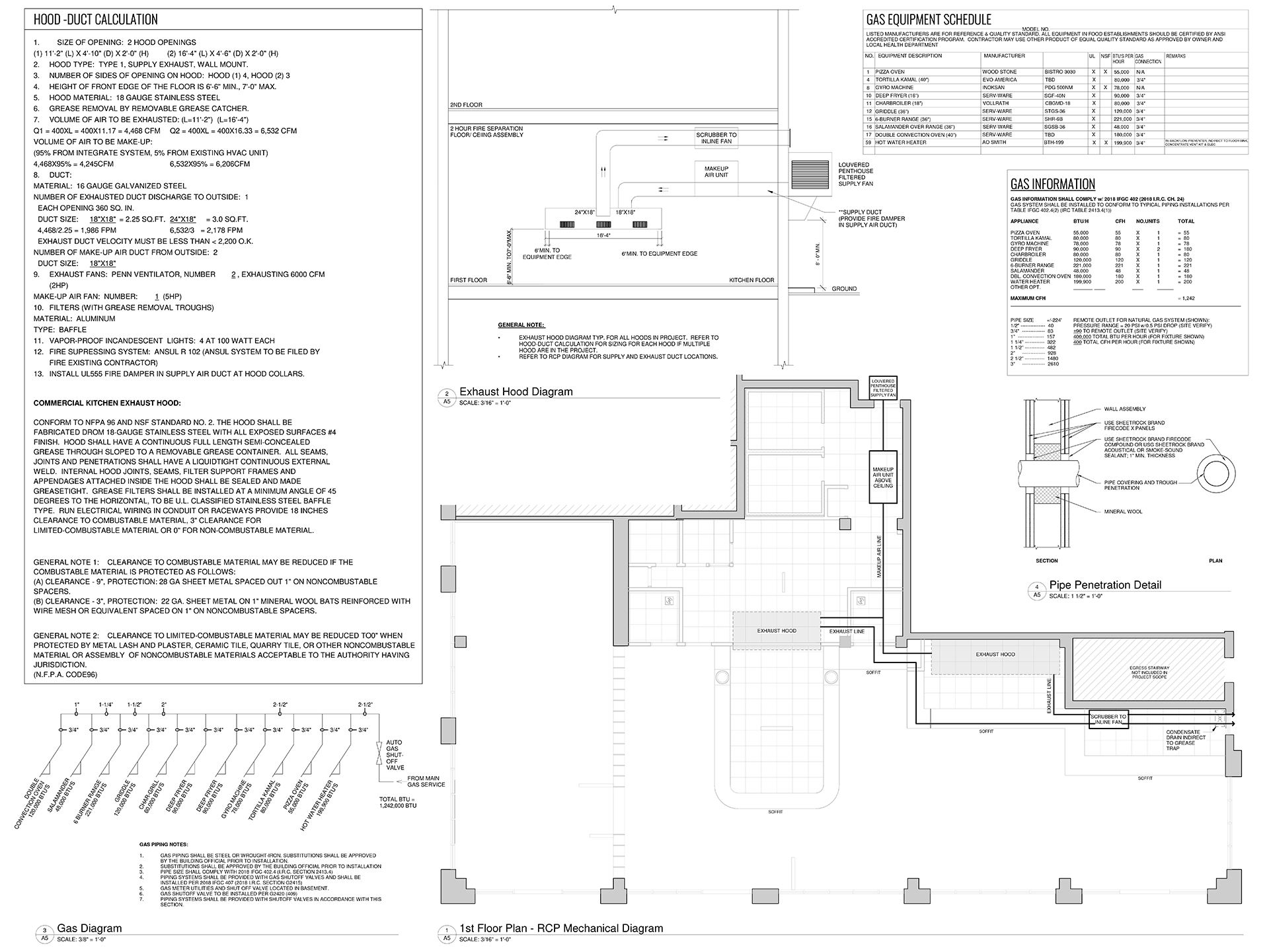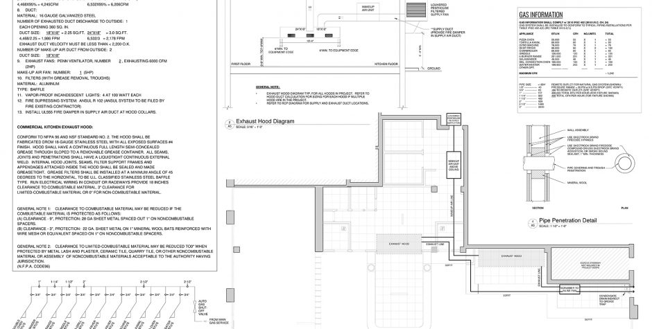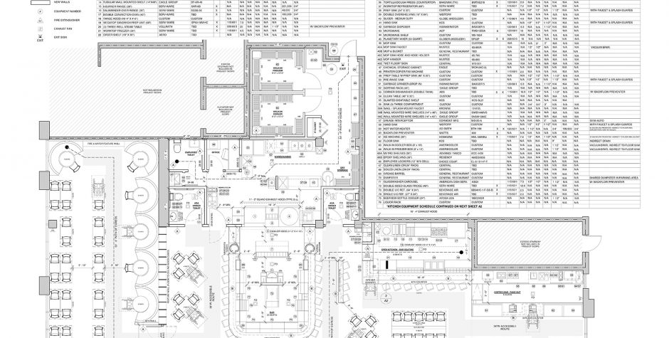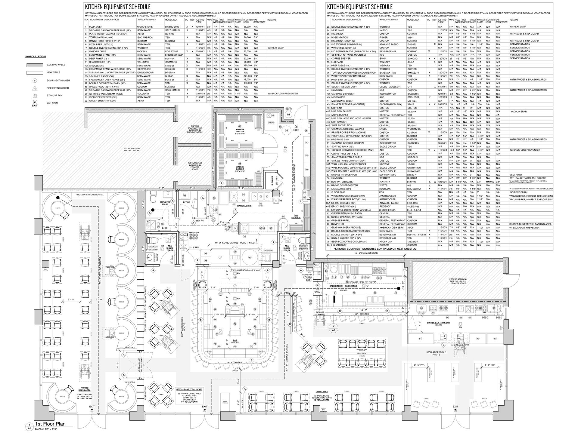 Health Department sets include floors plans and all kitchen equipment, finishes, electrical, plumbing, gas and exhaust hood drawings.